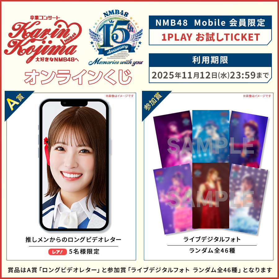 「NMB48 15周年コンサート&小嶋花梨 卒業コンサート オンラインくじ」開始!